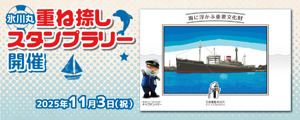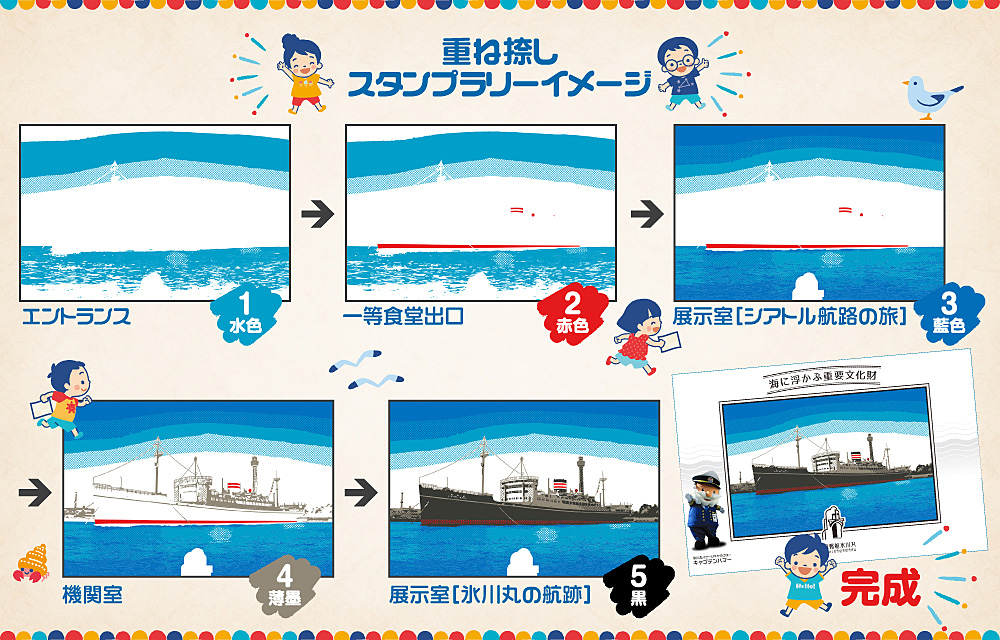 氷川丸の船内5カ所にあるスタンプ台を巡り、スタンプを重ね捺し、氷川丸の画像を完成させて、乗船記念品として持ち帰りましょう!